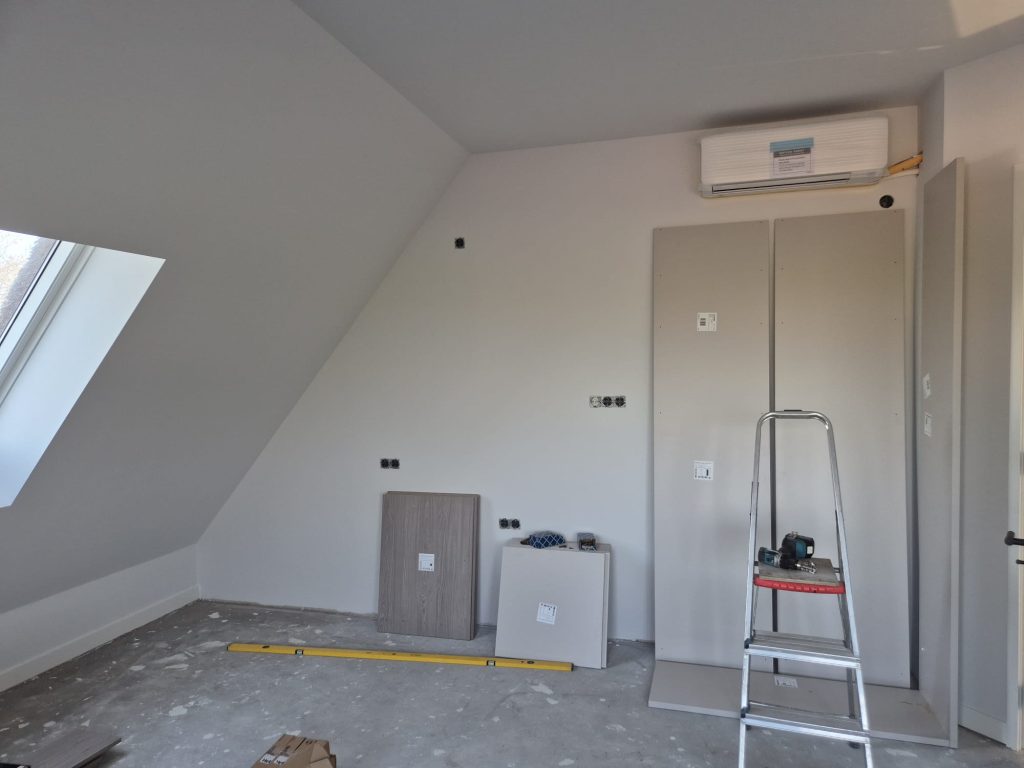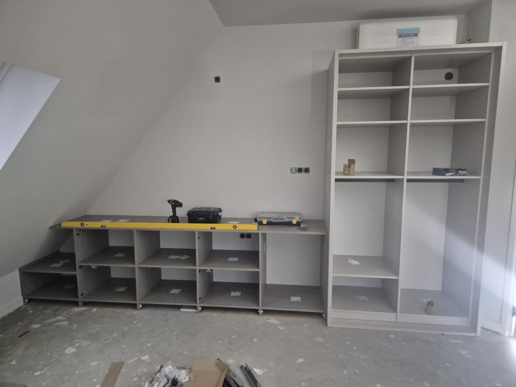 Onze Kasten op Maat bestaan uit losse kastinterieurs, interieurs met schuifdeuren én interieurs met draaideuren (ook wel scharnierende deuren genoemd) Doordat de materialen waarmee we werken beschikbaar zijn voor al onze systemen, is het prima mogelijk om verschillende systemen met elkaar te combineren. Zo ook bij deze opstelling; De lage kast is passend gemaakt onder de schuine kap en voorzien van scharnierende deuren en opliggende lades. Aansluitend hebben we een kast opgebouwd, die precies onder airco past en met een stoere zwarte omlijsting prachtig aansluit op de lage kast. Het glazen vlak in de schuifdeuren maken de opstelling exclusief…